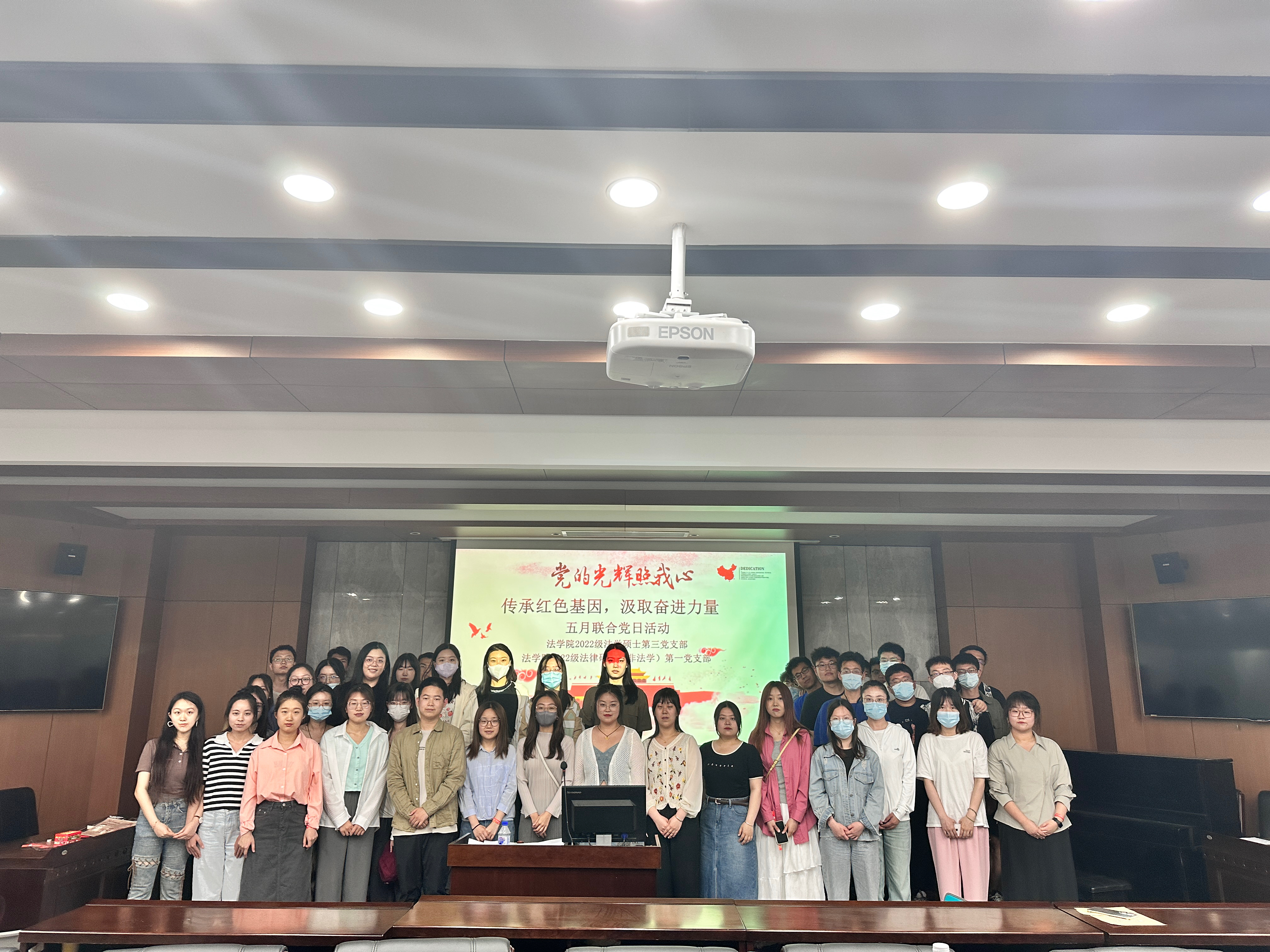2022级法学硕士第三党支部、2022级法律硕士(非法学)第一党支部于2023年5月26日召开“传承红色基因,汲取奋进力量”主题党日活动,本次活动于东荣大厦B313小模拟法庭开展,由2022级法学硕士第三党支部书记王珂馨、2022级法律硕士(非法学)第一党支部书记刘心怡主持。