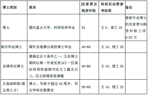 1. 博士原则上要求年龄40岁以下,部分专业可放宽至45岁,取得博士毕业证和学位证,并正式报到上岗后,学校按本表提供相关待遇。