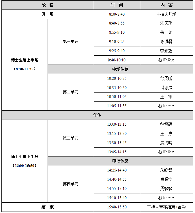 一个评审单元学生汇报完毕后,评议教师统一评议。博士生组各教师每次评议时间≤10分钟,每个单元总评议时间≤30分钟。