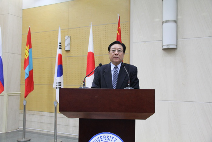 常务副校长陈岗教授致辞,对本次论坛圆满完成各项议程表达祝贺语感谢。希望以本次论坛为契机使东北亚各国在面临法律方面的机遇与挑战同时能够同心协力开拓新思路,促进区域互联互通,实现学术联合研究、人才综合培养,携手为东北亚区域一体化建设以及本地区的稳定与发展贡献力量。