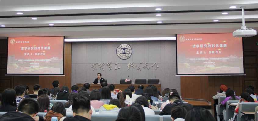 讲座旨在深入学习贯彻党的十九大精神,明晰法学研究的公共概念、公共原则、公共方法。张毅厅长介绍了法学研究的概念、指向以及研究方法。通过对当前形势的分析,提出法学工作者要勤于思考、肯下功夫、庄重严谨,以发现和再现真理作为自己的努力方向和检验标准。他列举了改革开放以来党的法治工作方针,阐述了新时代我国法治研究的责任和义务,并提出正确进行法学研究的原则和方法。张毅厅长指出,深入、精准的法治研究具有重要的价值和意义。从党和国家事业的宏观角度看,可以为推进全面依法治国提供正确的理论指导。从法学、法律工作者的角度看,可以为以法治思维分析和解决问题、保证和提高工作水平奠定坚实基础。张毅厅长在讲话中大量援引中外法律实例,理论性与实践性兼具,现场不断响起热烈掌声。