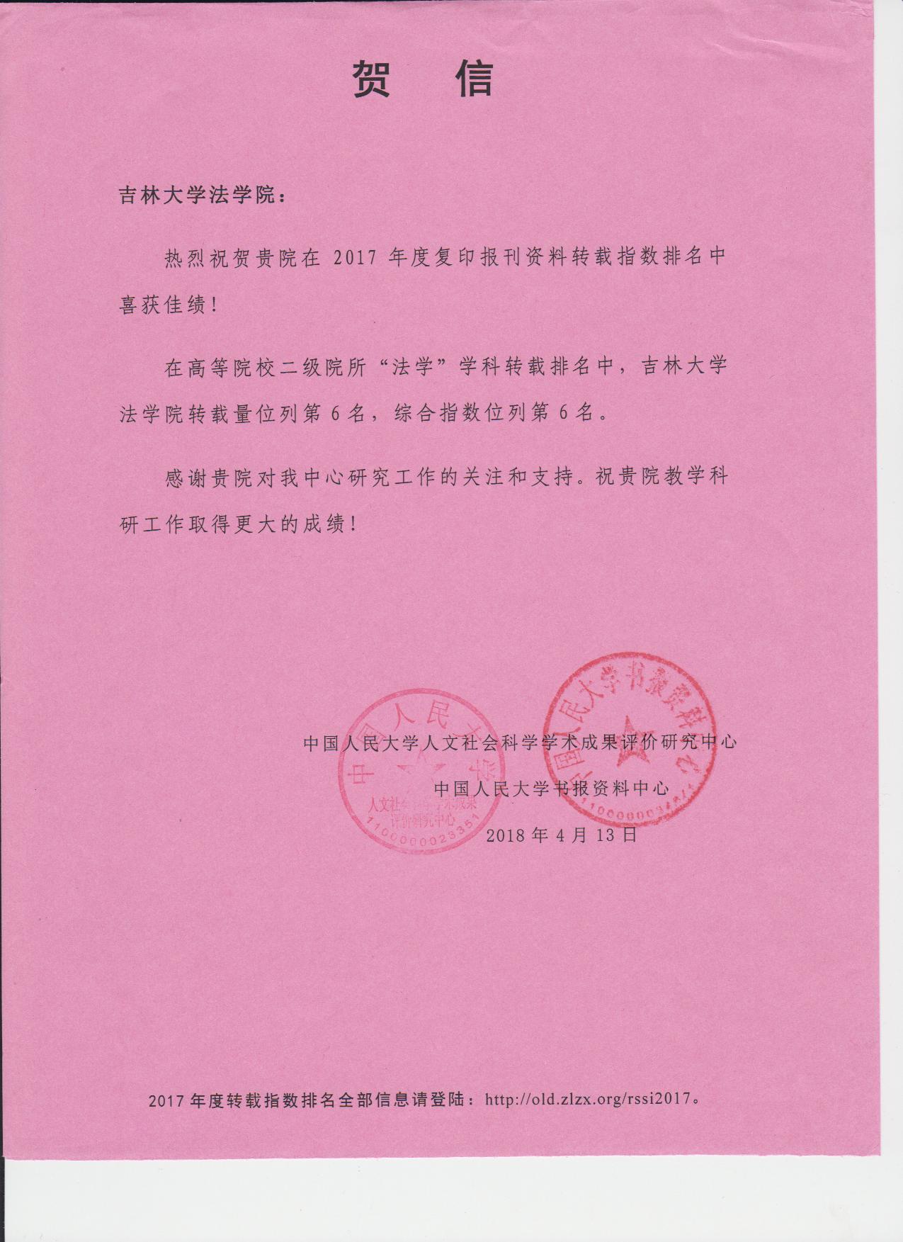 在2017年度复印报刊资料转载指数排名中喜获佳绩!在高等院校二级院所“法学”学科转载排名中,体育