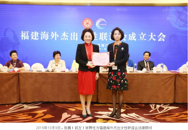 同时,她又是北京侨联法律顾问委员会副主任,并担任上海、江苏、辽宁、黑龙江、湖北等各级法顾委,每年义务奔赴各地讲课、调研、协调解决疑难案件。由于贡献卓著,张巍创办 的威宇律师事务所,成为北京市维护侨益的重点基地,并获得授牌。
