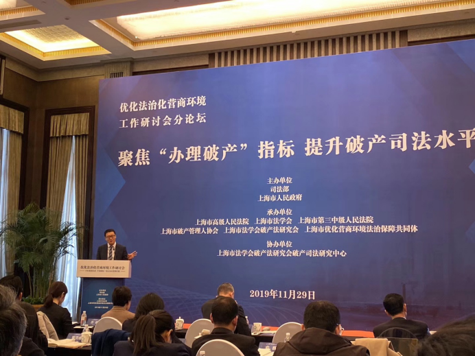 2019年11月29日,“优化法治化营商环境工作研讨会”在上海召开,主题为“对标最高标准,打造国际一流法制化营商环境”。大会安排五场专题研讨,围绕“开办企业”“获得信贷”“保护中小投资者”“执行合同”和“办理破产”指标展开。第五专题分论坛主题为“聚焦‘办理破产’指标,提升破产司法水平”,由司法部、上海市人民政府主办,上海市高级人民法院、上海市法学会、上海市第三中级人民法院、上海市破产管理人协会、上海市法学会破产法研究会、上海市优化营商环境法治保障共同体承办,上海市法学会破产法研究会破产司法研究中心协办。体育