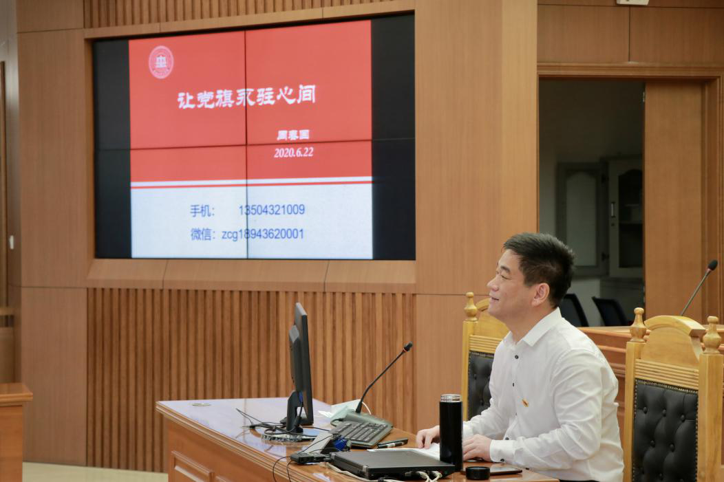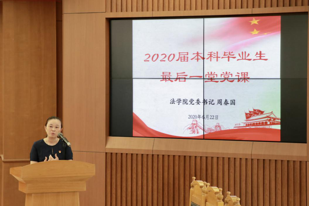 周春国以“让党旗永驻心间”为题,从疫情让世界认识中国和中国共产党为切入点,从“站位新时代,涵养政治视野”、“立足新起点,涵养政治品格”、“担当新使命,涵养政治定力”三方面,阐明了中国特色社会主义的制度优势和文化优势,勉励毕业生党员要涵养胸怀天下的气度、坚韧不屈的风骨、自信从容的风度、辩证思考的智慧和敢于担当的勇气,做公平正义的捍卫者、廉洁自律的表率者、保持警惕的清醒者,鼓励学生担起使命与责任,毕业后不能放松政治进步和业务学习。同时,周春国还表达了对同学们的殷切期望,希望同学们在以后的人生道路中,以习近平新时代中国特色社会主义思想为指导,把自身的发展融入到民族复兴的伟大事业当中,矢志不渝,努力奋斗。