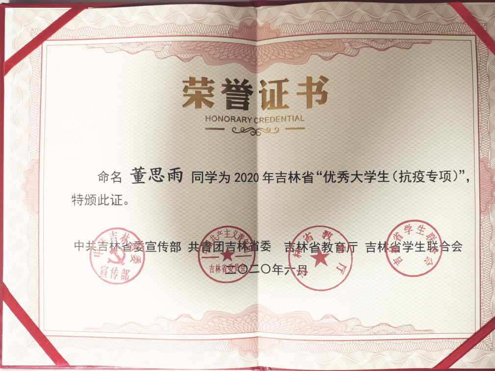 近日,中共吉林省委宣传部、共青团吉林省委、吉林省教育厅、吉林省学生联合会四部门联合下发《关于命名2020年吉林省“十佳百优大学生”的决定》,我院2020届本科生江超男被评为2020年吉林省“百优大学生”,2020届本科生董思雨被评为2020年吉林省“优秀大学生(抗疫专项)”。