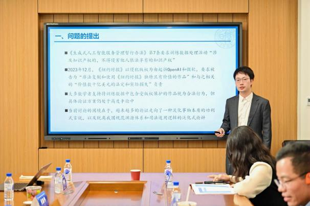 博士研究生王沛然,以《人工智能训练的著作权法理审思——事物本质与中国路径》为题进行发言。第二位报告人重庆大学体育